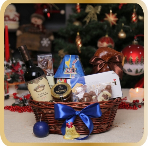 Blue Santa este un cadou deosebit, ce contine specialitati dulci precum cozonac, turta dulce, caramele asortate, figurina de ciocolata, tablete de ciocolata, toate acompaniate de vin rosu. Cosul cadou este ambalat si decorat manual, in spiritul Craciunului, gata de a fi oferit cu ocazia sarbatorilor de iarna.