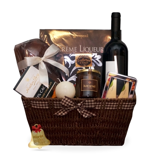 Cos cadou Fancy Chocolate Christmas este un cadou deosebit, ce contine specialitati dulci, precum cozonac, praline delicioase, caramel fin, trufe cu sampanie si ciocolata amaruie, toate acompaniate perfect de un vin rosu special si ceai negru. Cosul cadou este ambalat si decorat manual, gata de a fi oferit cu ocazia sarbatorilor de iarna.