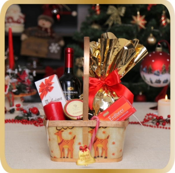 Santa’s Reindeers este un cadou deosebit, ce contine specialitati dulci precum panettone, praline de ciocolata, toate acompaniate de vin rosu. Cosul cadou este ambalat si decorat manual, in spiritul Craciunului, gata de a fi oferit cu ocazia sarbatorilor de iarna.