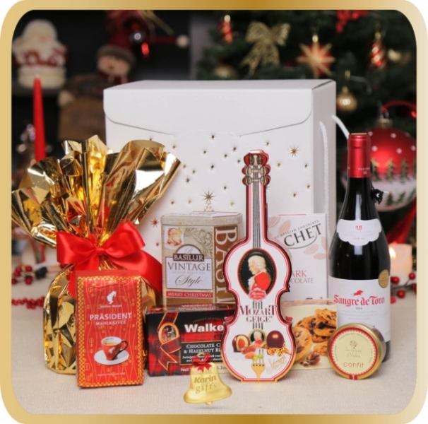 Cadou Mozart este un cadou deosebit, ce contine specialitati dulci precum panettone, ceai, cafea, fursecuri, confit, praline de ciocolata, toate acompaniate de vin rosu. Cosul cadou este ambalat si decorat manual, in spiritul Craciunului, gata de a fi oferit cu ocazia sarbatorilor de iarna.