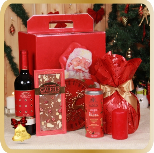Santa's smile este o cutie cadou speciala ce contine delicii precum panettone cu portocala, fursecuri si ciocolata cu ananas si merisoare. Toate acestea sunt acompaniate de un vin rafinat si un ceai aromat. Cutia este transformata intr-un cadou special pentru sarbatorile de iarna!